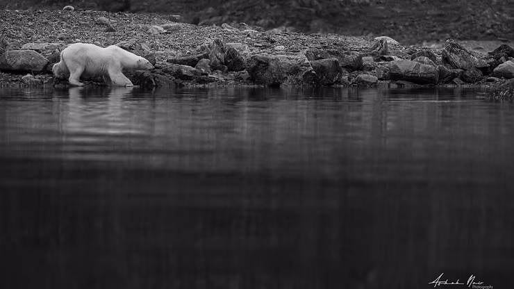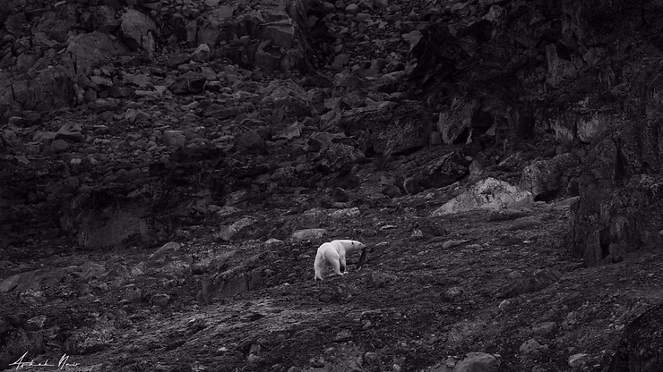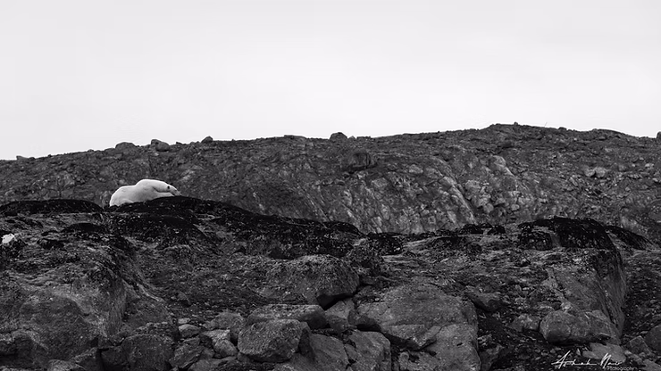When we first saw her, she was lying on top of the rocks, in that utterly restful pose most polar bears take, head resting on her paws, looking ahead in a placid manner. Bears can stay in that pose for hours, in an attempt to conserve energy but, our lady got up and ambled over the rocks, descending from her rocky abode.