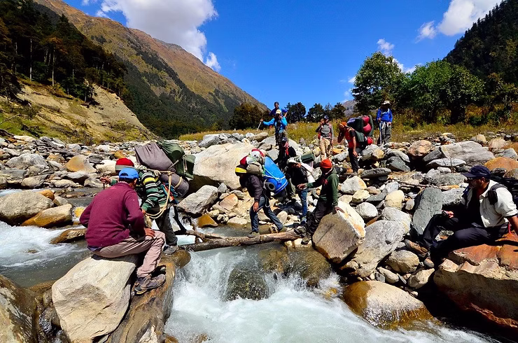 No such luck here. The Auden’s Col trek makes a statement from the first day itself. The slopes are steep, the tracks at many places narrow and having loose soil, loose rocks and then there are scarily narrow wooden logs that serve the purpose of bridges across rushing waters. You get the picture ?